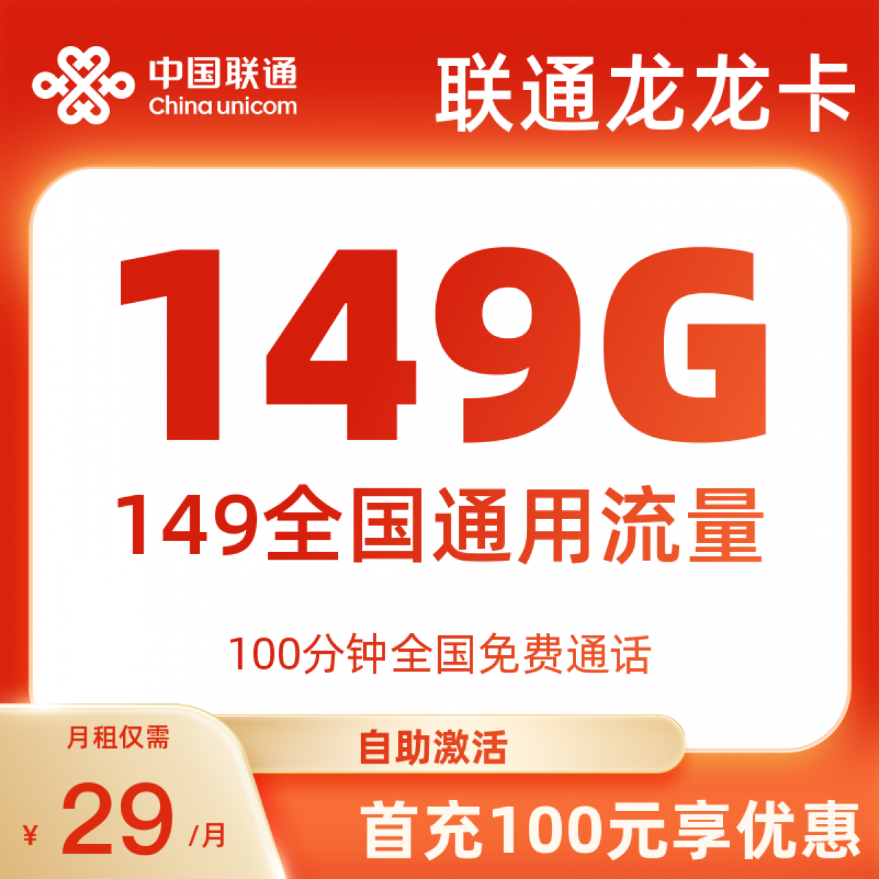 联通龙龙卡29元149GB+100分钟(全国发货,自主激活,长期套餐) 激活达标返120元